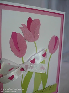 For the lightest layer of my center tulip, I brushed Bashful shimmer brush to give it some sparkle. A piece of Adventure ribbon finished off this simple card. (Notice how I made "grass" by cutting fringe on a strip of Sweet Leave cardstock.)